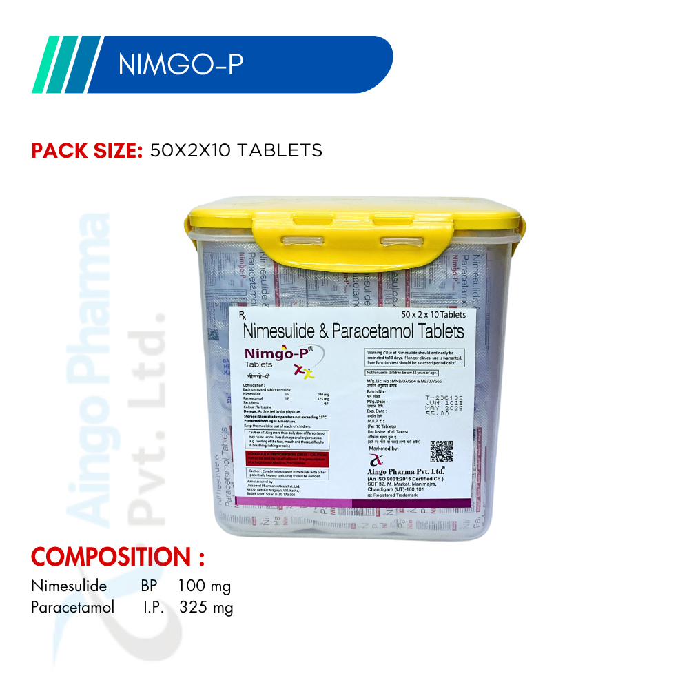 - Nimgo‑P Tablets present a powerful co‑formulation of Nimesulide 100 mg BP and Paracetamol 325 mg IP, designed to offer fast, double‑action relief from pain, inflammation, and fever. Nimesulide […]