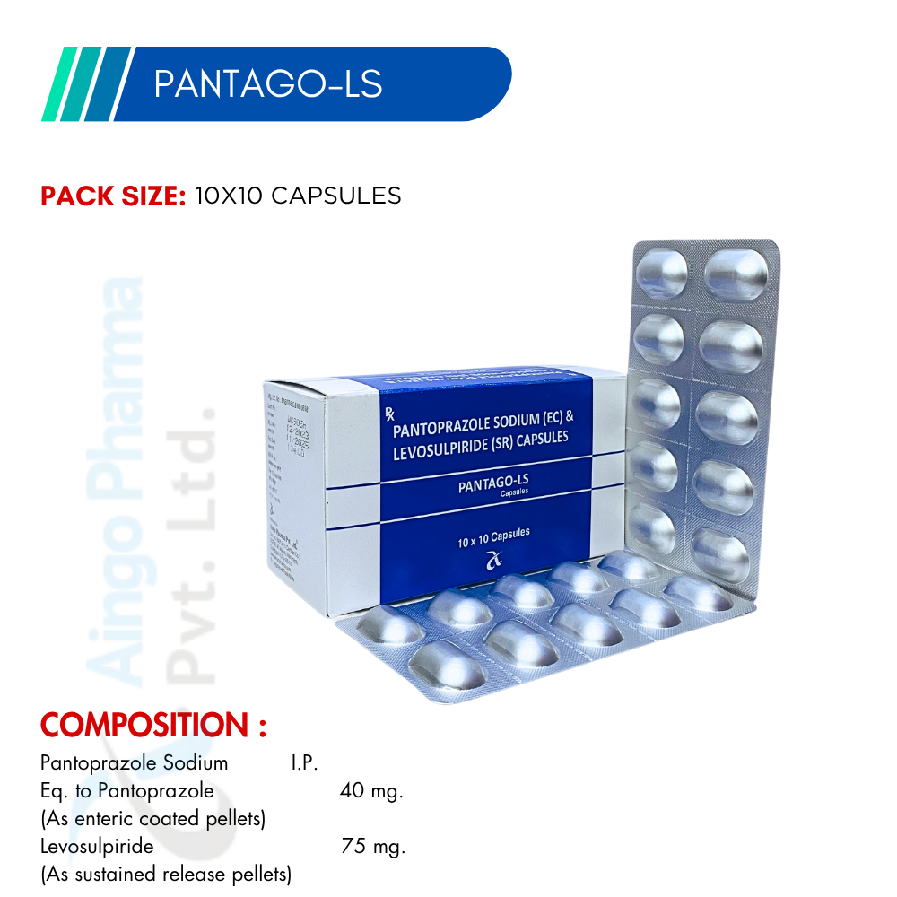- PANTAGO-LS is a potent dual-action therapy offered by Aingo Pharma, formulated with Pantoprazole Sodium I.P. 40 mg (EC) and Levosulpiride I.P. 75 mg (SR). This combination […]
