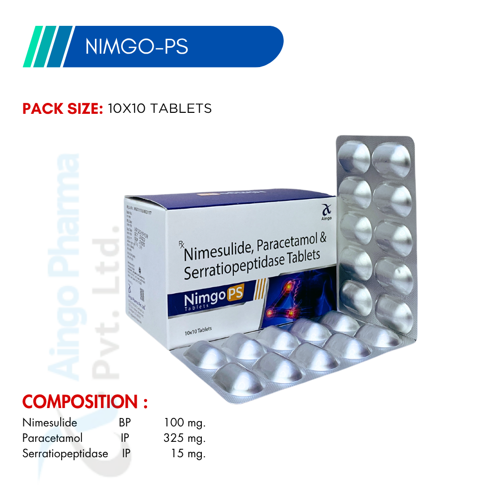 - NIMGO‑PS Tablets bring together three clinically effective agents: Nimesulide 100 mg (NSAID), Paracetamol 325 mg (analgesic/antipyretic), and Serratiopeptidase 15 mg (anti-inflammatory enzyme). This potent triple-action formula offers rapid and […]
