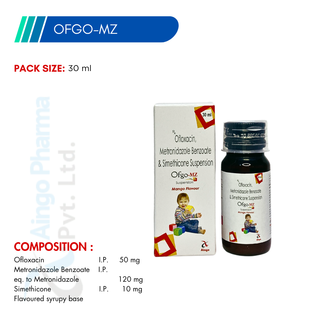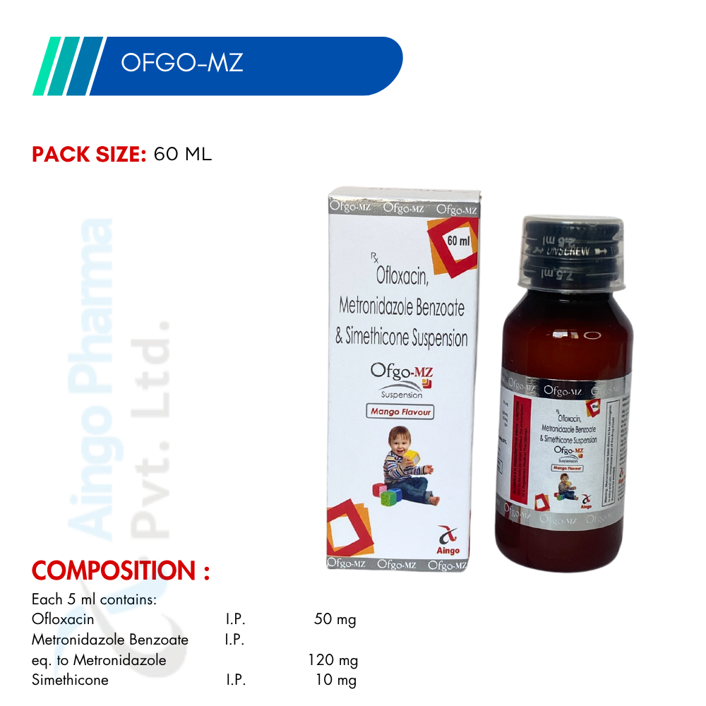 - Ofgo-MZ Suspension is a pediatric and adult-friendly oral suspension formulated with Ofloxacin (50 mg), Metronidazole Benzoate (120 mg), and Simethicone (10 mg) in a tasty mango-flavored […]