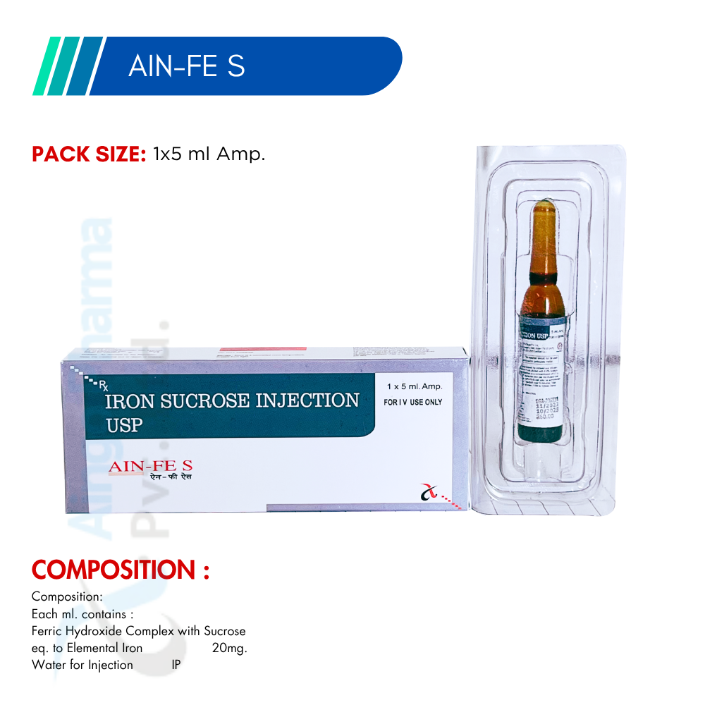 AIN-FE S is an injectable iron supplement containing Iron Sucrose, used in the treatment of iron deficiency anemia. It is particularly beneficial for patients with chronic kidney disease who cannot take oral iron. Administered intravenously, it replenishes iron stores and helps improve hemoglobin levels effectively.