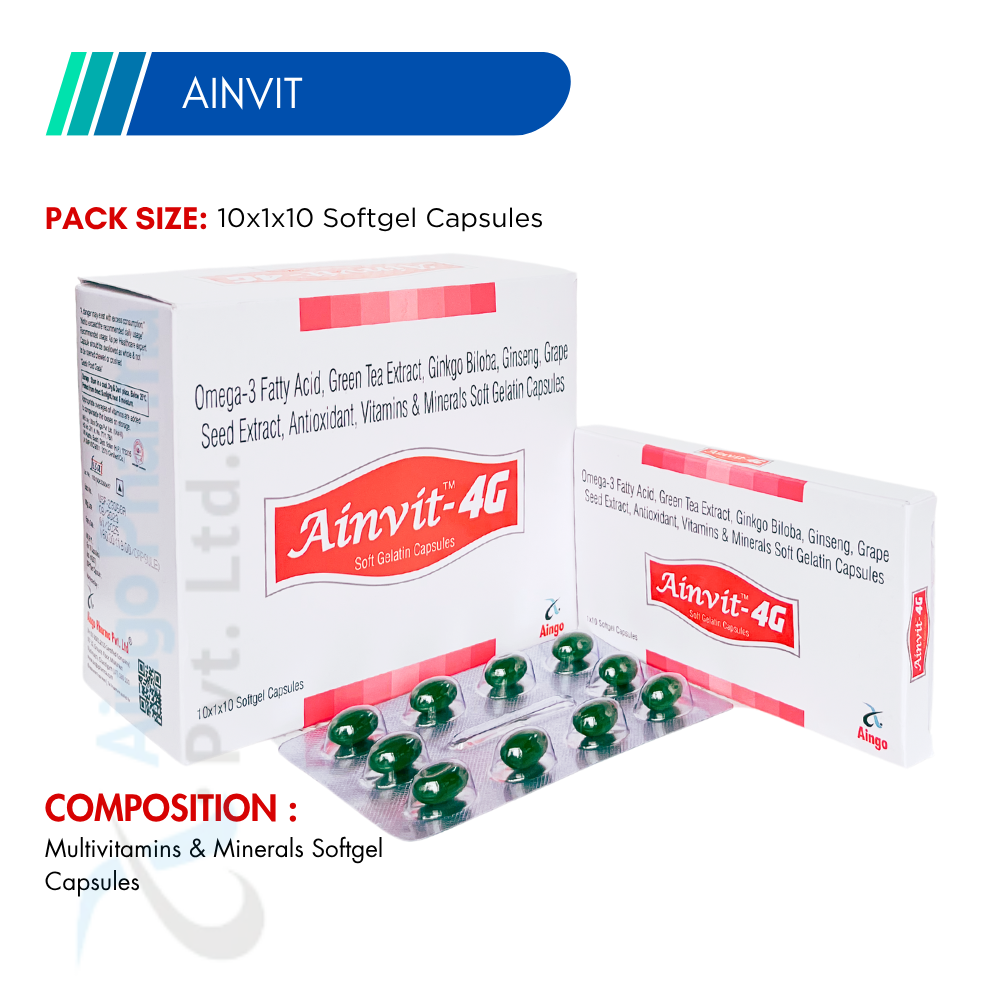 Ainvit-4G is a premium health supplement containing Omega-3 fatty acids, Ginseng, Green Tea Extract, Ginkgo Biloba, Grape Seed Extract, and a comprehensive range of multivitamins and minerals. It acts as a powerful antioxidant, enhances mental alertness, supports cardiovascular health, and strengthens immunity. Ideal for patients needing extra nutritional support in today’s stressful and fast-paced lifestyle.