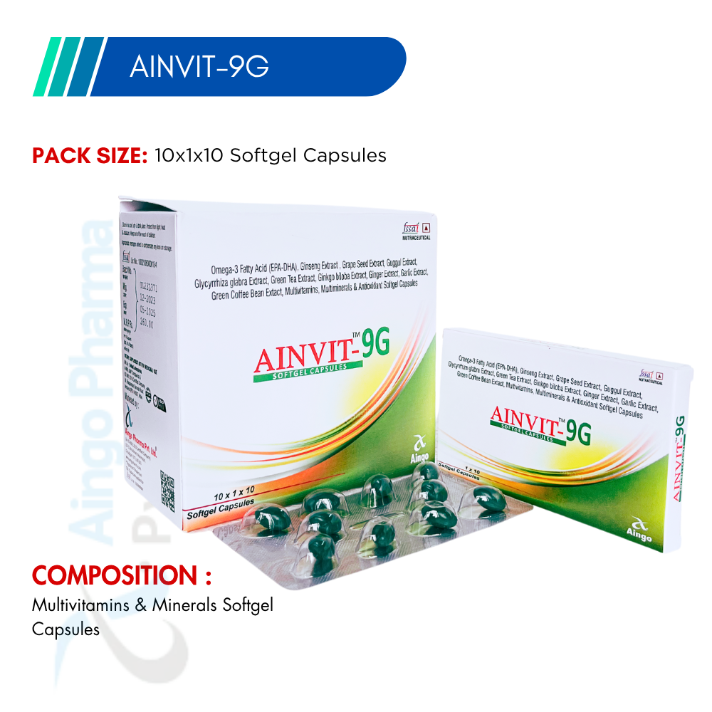 AINVIT-9G softgels feature a high-performance blend of Omega-3 Fatty Acids (EPA & DHA), herbal extracts (Ginseng, Garlic, Green Tea, Ginger), antioxidants (Grape Seed, Lycopene), and essential vitamins and minerals. Ideal for boosting cardiovascular, cognitive, and immune health. A true daily wellness formula for energy, focus, and cellular protection.