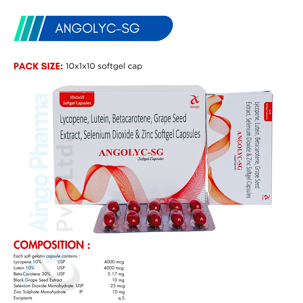 Ango-Q10 Softgel Capsules combine Coenzyme Q10 (100 mg), L-Carnitine (250 mg), Omega-3 fatty acids (EPA:DHA 90:60 mg), Lycopene (6000 mcg), Selenium, Zinc, and L-Arginine (100 mg) in a synergistic formula designed for cardiac health, energy production, fertility, and antioxidant protection.