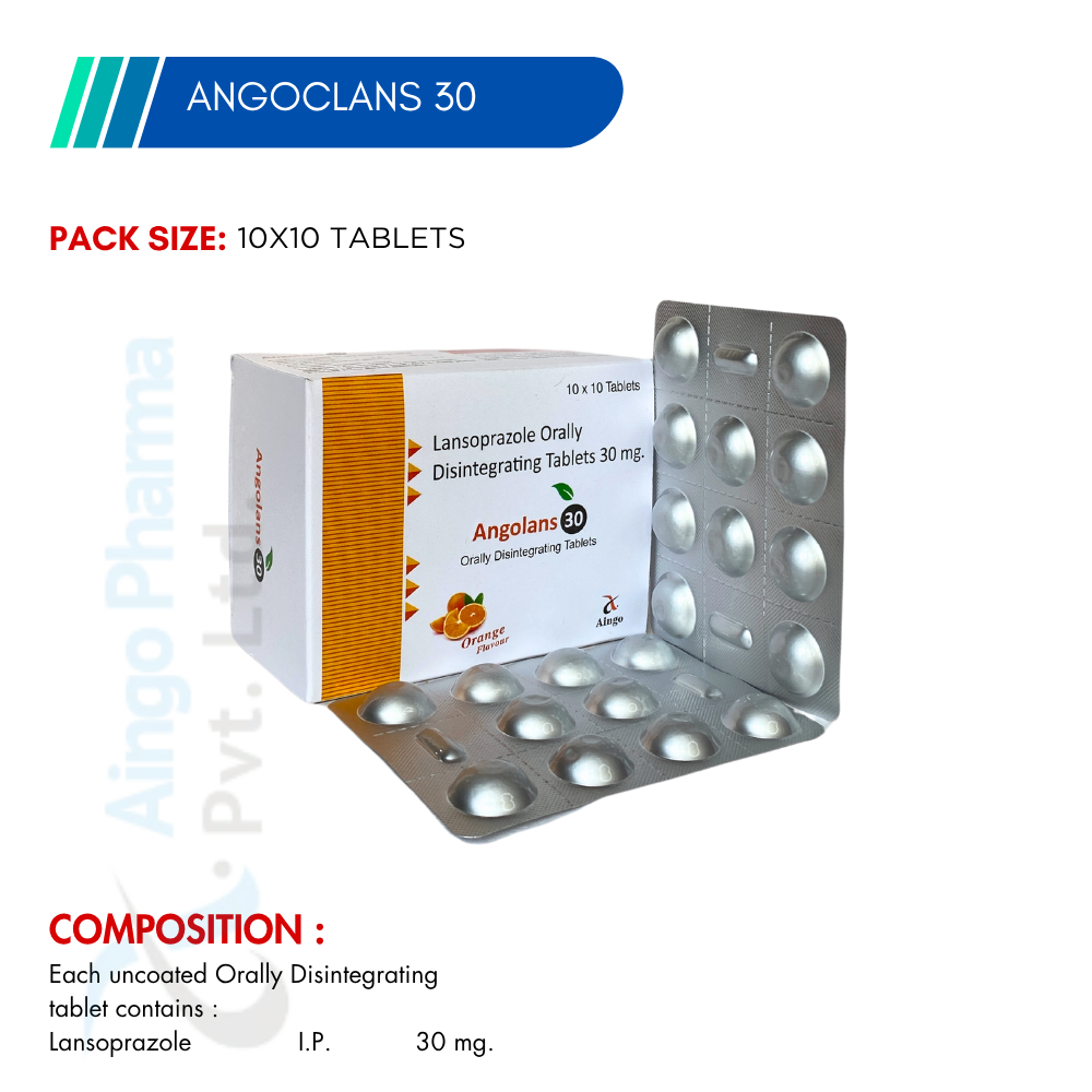 ANGOLANS 30 is an orally disintegrating tablet that contains Lansoprazole (30mg), a proton pump inhibitor (PPI) that helps reduce stomach acid. It is used for the treatment of gastric ulcers, acid reflux, and conditions associated with excessive stomach acid. The orally disintegrating formulation makes it easy to administer without water, ideal for patients with difficulty swallowing.