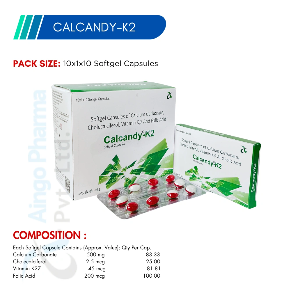 Calcandy-K2 is a comprehensive supplement containing Calcium Carbonate, Cholecalciferol (Vitamin D3), Vitamin K2-7, and Folic Acid. Ideal for bone strength, osteoporosis prevention, and cardiovascular support. Each pack has 10x1x10 softgel capsules. Perfect for patients needing bone regeneration and mineral balance.