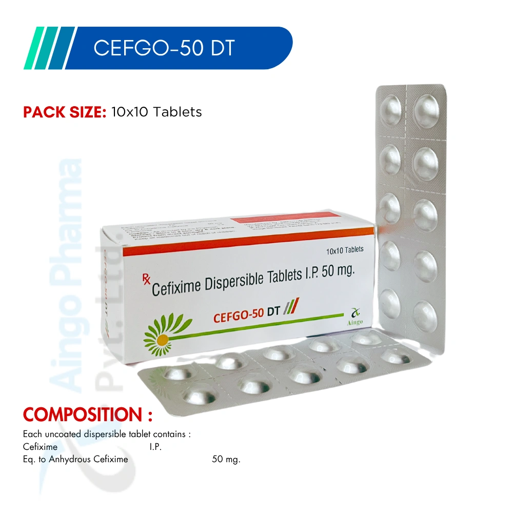 CEFGO-50 DT by Aingo Pharma provides Cefixime 50 mg in an easy-to-dissolve tablet for children and adults. Used for respiratory tract infections, UTIs, and typhoid. Quick absorption ensures faster recovery.
