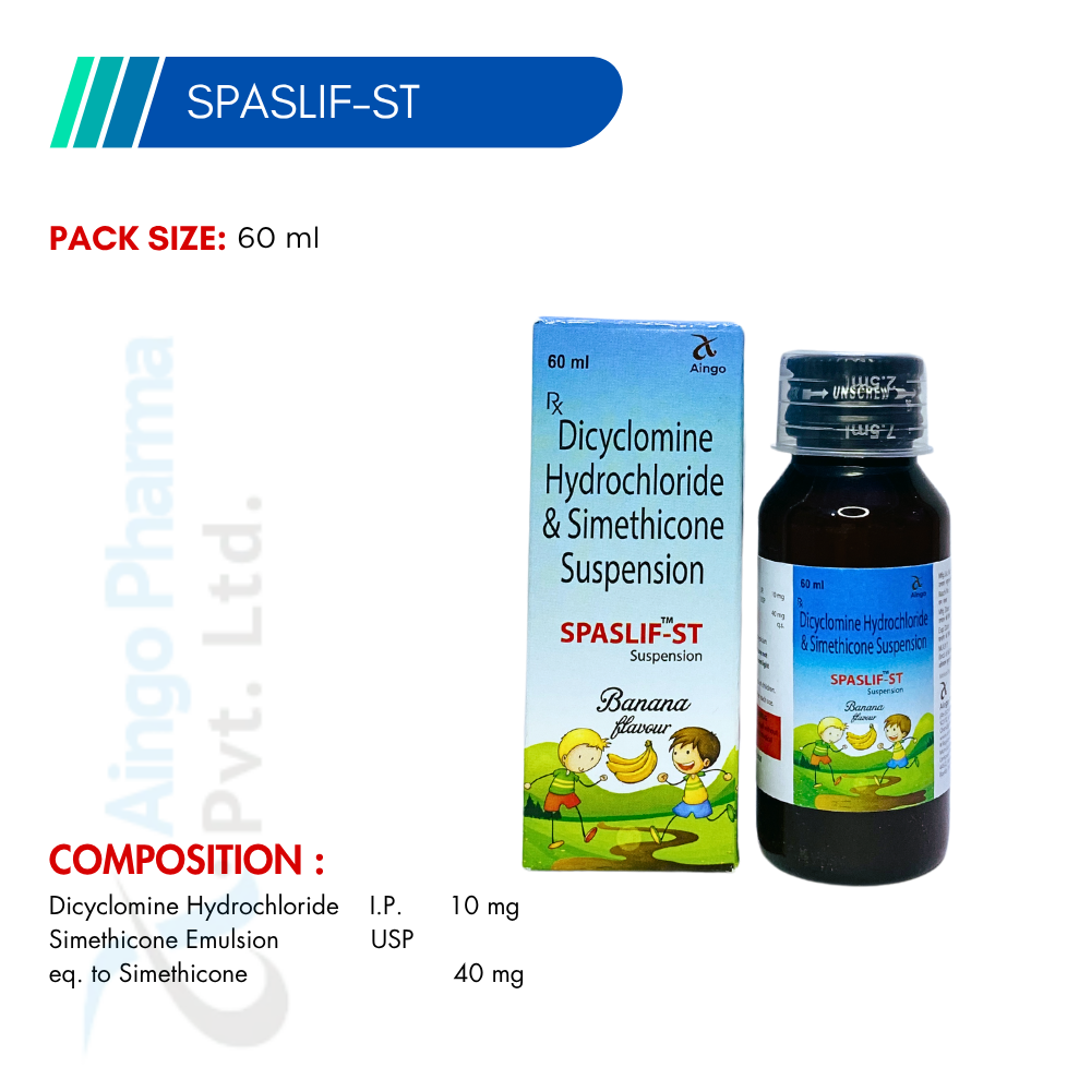 Spaslif-ST Suspension is a trusted and fast-acting oral formulation designed to relieve abdominal cramps, gas buildup, and digestive discomfort. Each 5ml of Spaslif-ST contains Dicyclomine Hydrochloride I.P. 10 mg and Simethicone USP 40 mg, making it a potent antispasmodic and antiflatulent combination.