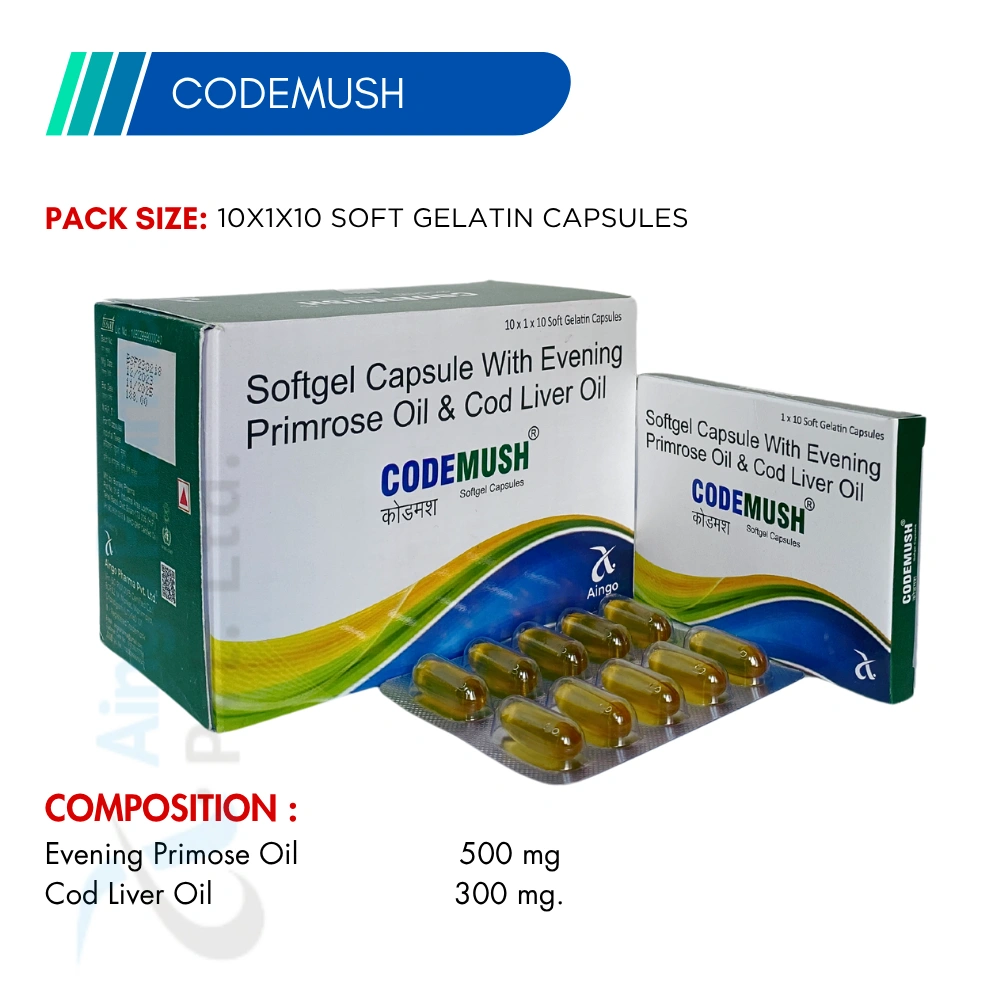 Codemush is a nutritional supplement combining Evening Primrose Oil and Cod Liver Oil. Rich in Omega-3 and GLA, it helps maintain hormonal balance, reduces inflammation, and promotes healthy skin and joints. Especially useful for women’s health and arthritis support.