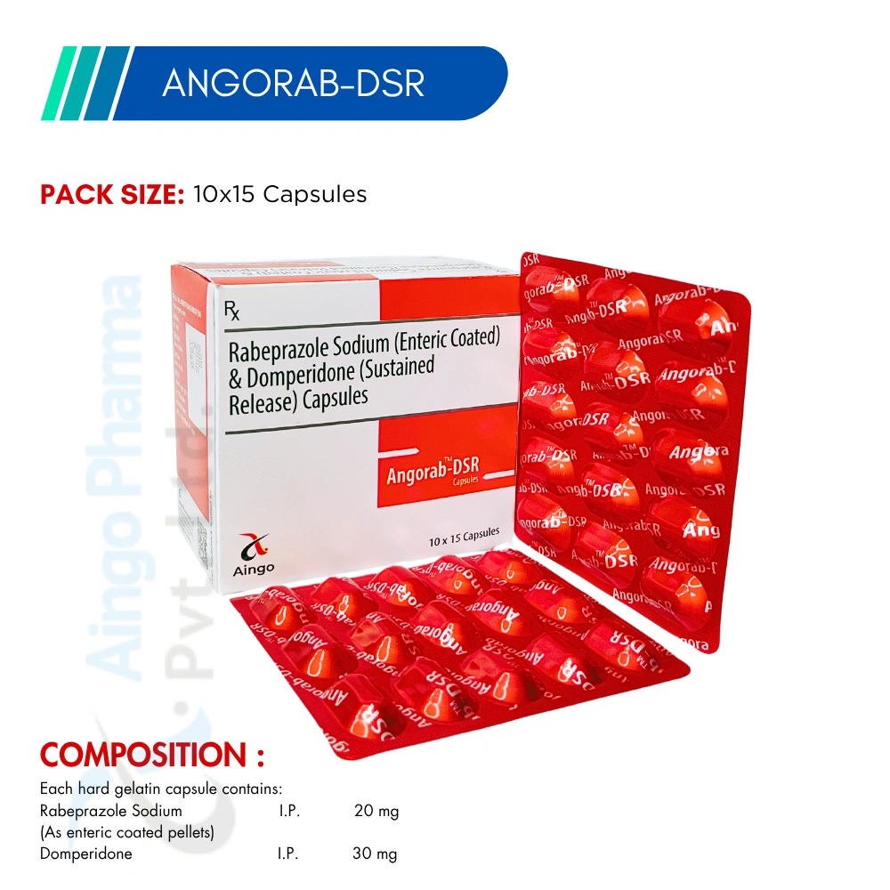 Angorab-DSR is a dual-action capsule containing Rabeprazole 20 mg and Domperidone 30 mg. It helps in managing GERD, bloating, and delayed gastric emptying. It ensures fast symptom relief with sustained protection. Pack size: 10×15 capsules.