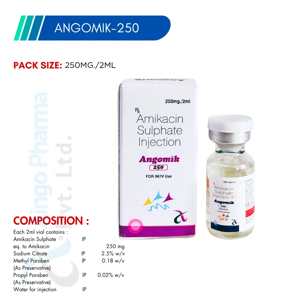 ANGOMIK-250 contains Amikacin, a broad-spectrum aminoglycoside antibiotic used in serious bacterial infections including respiratory, abdominal, and urinary tract infections, especially when resistant to other antibiotics.