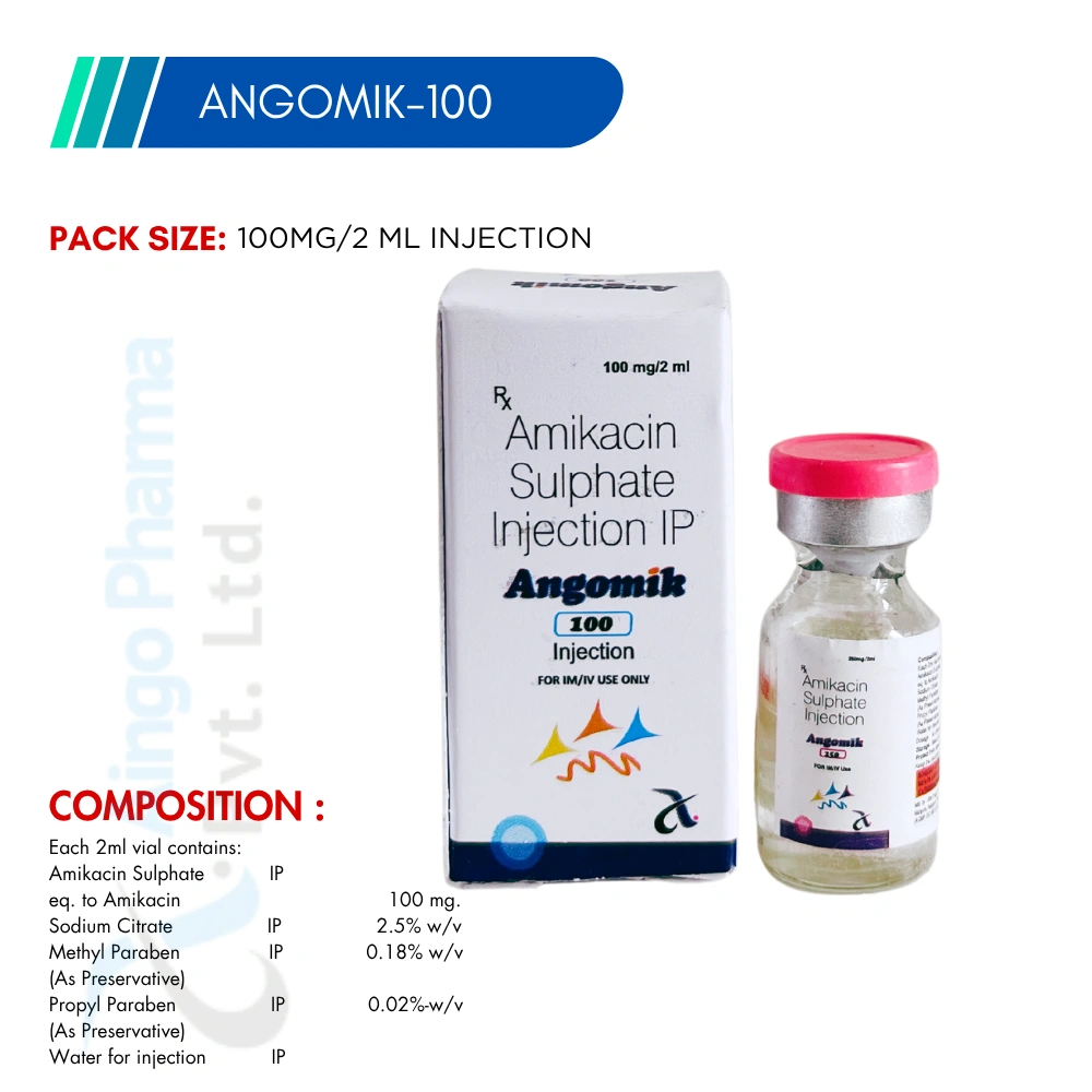 ANGOMIK-100 is a pediatric-friendly dosage of Amikacin used in severe infections. It provides fast bacterial clearance and is commonly prescribed in neonatal and pediatric care.