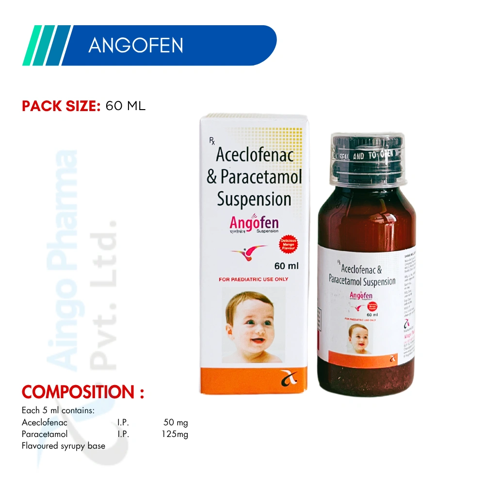Angofen is a safe and effective pediatric formulation combining Aceclofenac (50mg) and Paracetamol (125mg) per 5ml. Ideal for reducing fever and relieving pain in children. Comes in a flavored syrup base for palatability.