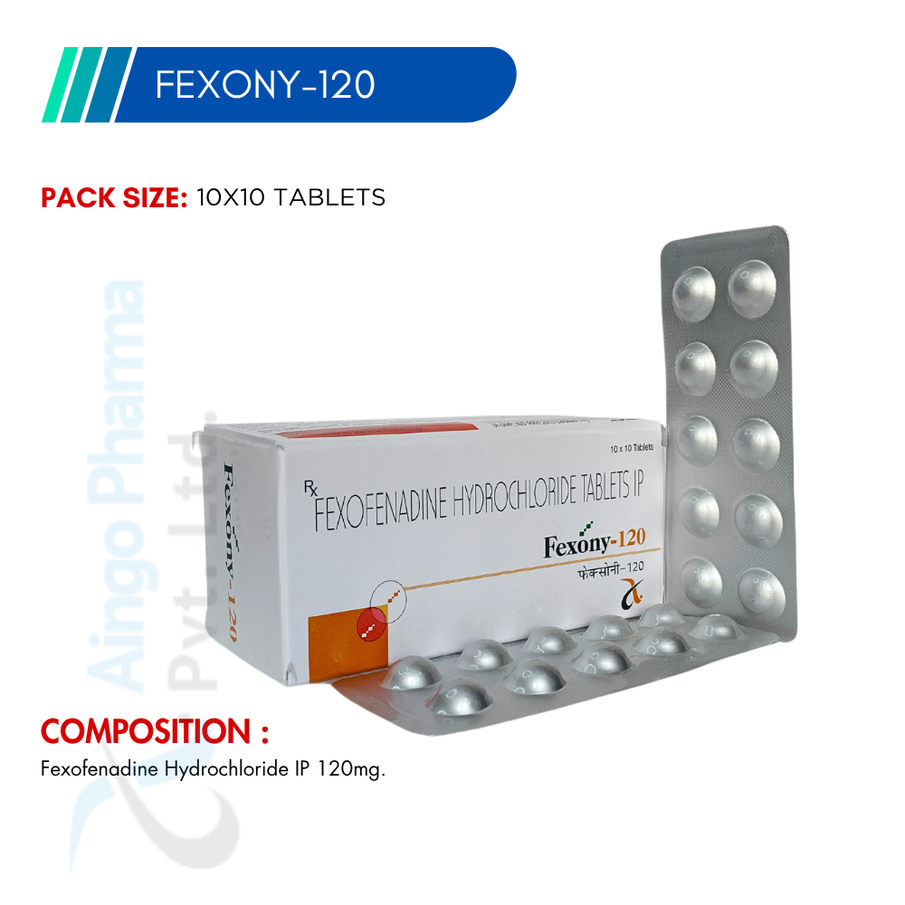Fexony-120 contains Fexofenadine Hydrochloride 120 mg, a non-sedating antihistamine used to treat allergic rhinitis and skin rashes.