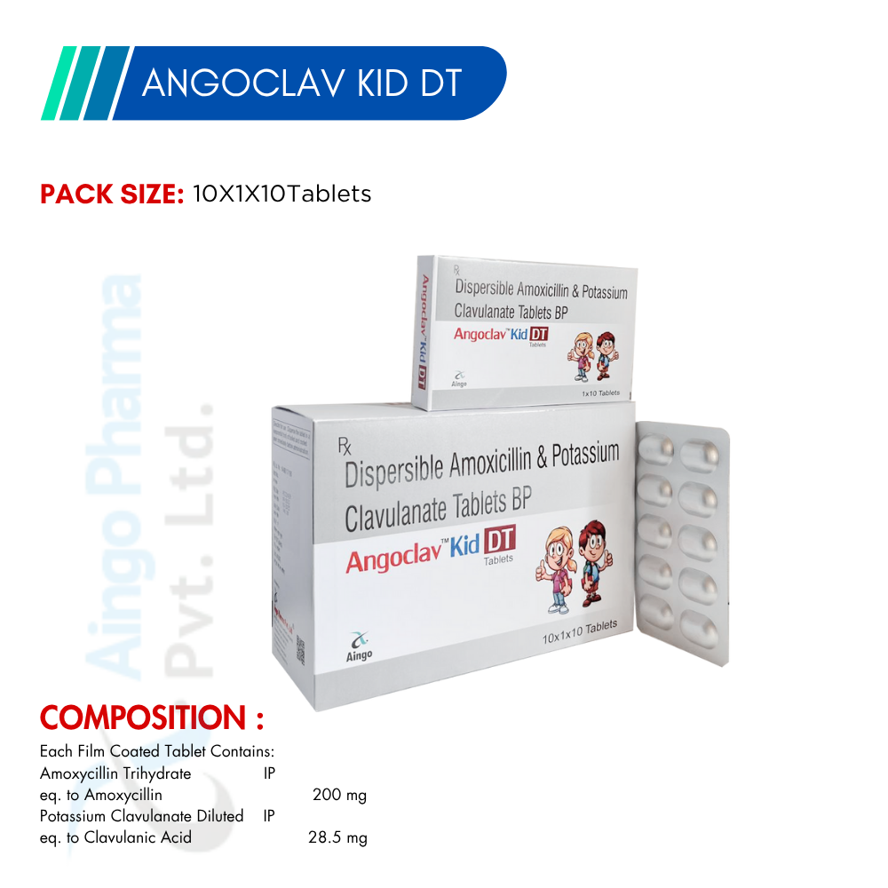 Angoclav Kid DT is a pediatric-friendly dispersible tablet combining Amoxicillin 200 mg and Clavulanic Acid 28.5 mg. This combination provides a broad spectrum of antibacterial coverage, making it effective in treating respiratory tract infections, otitis media, urinary tract infections, and skin infections in children. Easy to administer and gentle on the stomach.