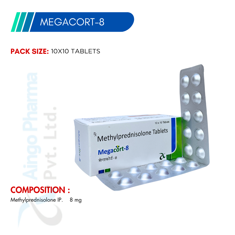 Megacort-8 is Aingo Pharma’s premium corticosteroid formulation containing 8 mg of Methylprednisolone per tablet. It is used to manage inflammatory conditions like arthritis, lupus, allergic reactions, and respiratory disorders.