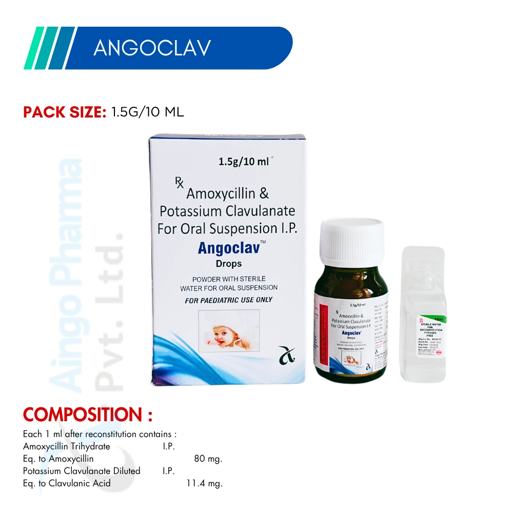 ANGOCLAV Drops are an oral suspension designed for infants, combining Amoxycillin and Clavulanate to fight resistant infections in the respiratory and urinary systems. Easy to administer and palatable.